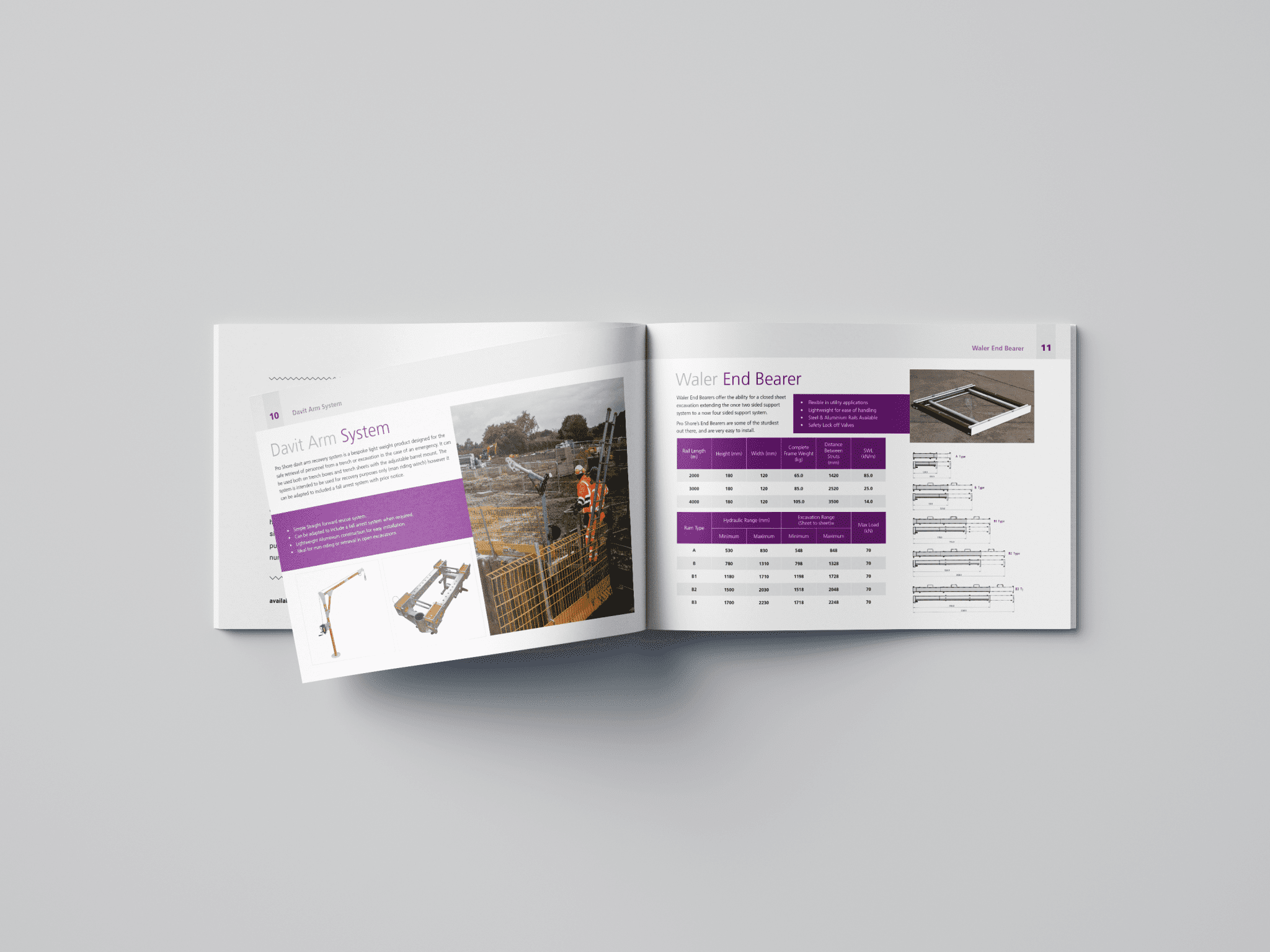 Proshore came to Northern Media to create a product brochure. The brochure would be used in print form as well as digitally on their website and on social media platforms. The primary objective is to create a brochure that effectively informs audiences about the client’s identity, the products they offer and their technical specifications. The design should adhere to the Proshore’s purple and green branding while ensuring all product information is current, easy to follow and is styled in a modern design. Usability and navigation are crucial to providing a the best experience for users, enabling them to easily find the information they are looking for and make informed decisions about which product is best fit their shoring project.